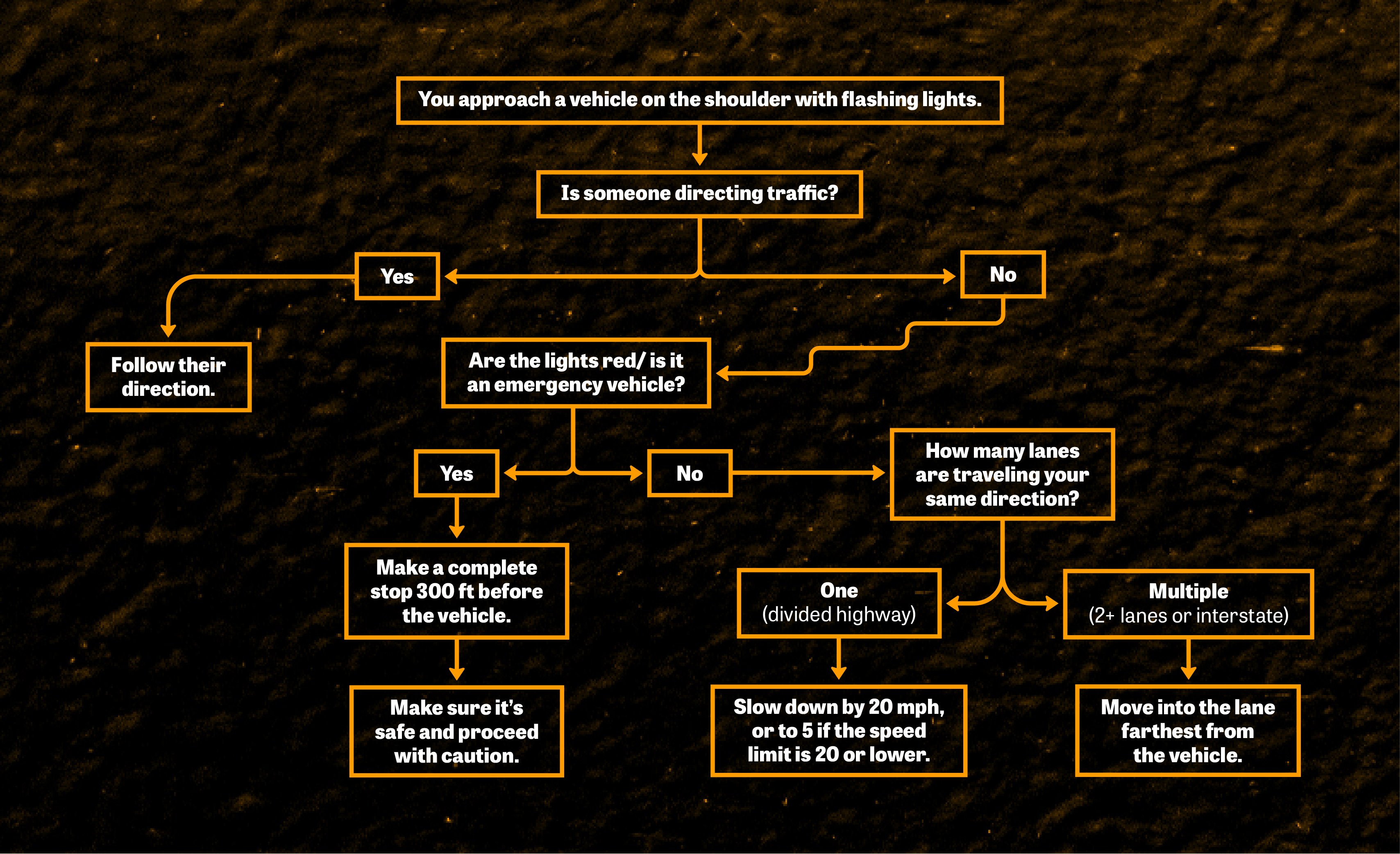 The law states that you must move over for vehicles with flashing lights occupying the side of the road. It’s meant to protect drivers who operate service vehicles, highway maintenance workers, or anyone experiencing car trouble.